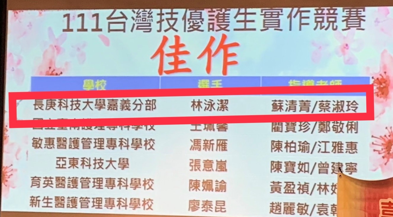 賀本系蘇清菁、蔡淑玲教師指導林泳潔同學參與111台灣技優護生實作競賽榮獲佳作。