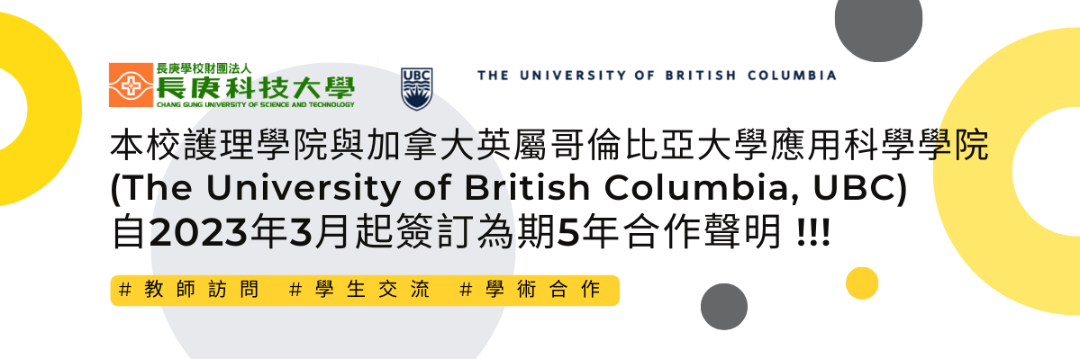 本校護理學院與加拿大英屬哥倫比亞大學(The University of British Columbia, UBC)應用科學學院順利於2023年3月簽訂為期5年的合作聲明。加拿大英屬哥倫比亞大學為國際知名大學。2021 年世界大學排名第 42 名,在護理領域位居世界排名第 27 名,加拿大排名則名列前三名。UBC 的護理系歷史悠久並孕育許多優秀的領導人才,其研究產能在加拿大大學中名列前茅。