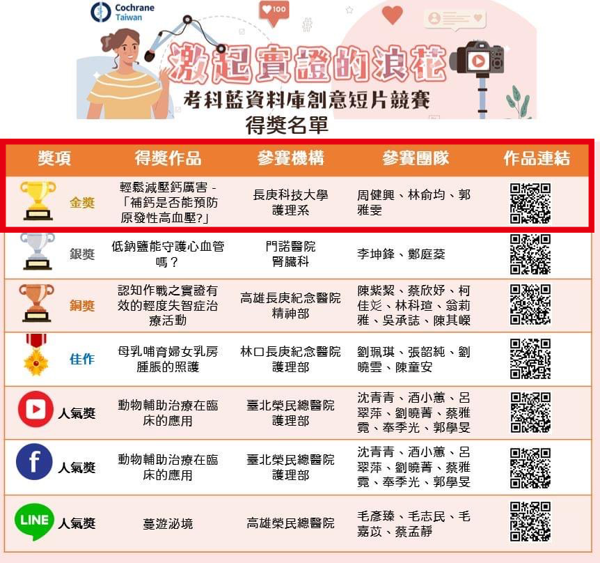 考科藍 (The Cochrane) 是一具國際性透過全球性的同儕合作與學習的研究網絡,以發表高品質、公正獨立的健康照護成效之系統性文獻回顧證據為主要發展。台灣考科藍臺灣研究中心 (Cochrane Taiwan) 於2015年經認證成立,致力於強化考科藍文獻回顧在臺灣及東亞地區的應用與影響。此次獲獎作品「輕鬆減壓鈣厲害-補鈣是否能預防原發性高血壓」,學生將「實證護理」課程學習後之成效,在系上老師的指導下,以貼近長者生活化之短片方式詮釋艱澀的實證知識,幫助民眾理解具實證知識的教育內容,獲得Cochrane Taiwan評審的青睞,展現本校師生教與學之量能,成果豐碩。