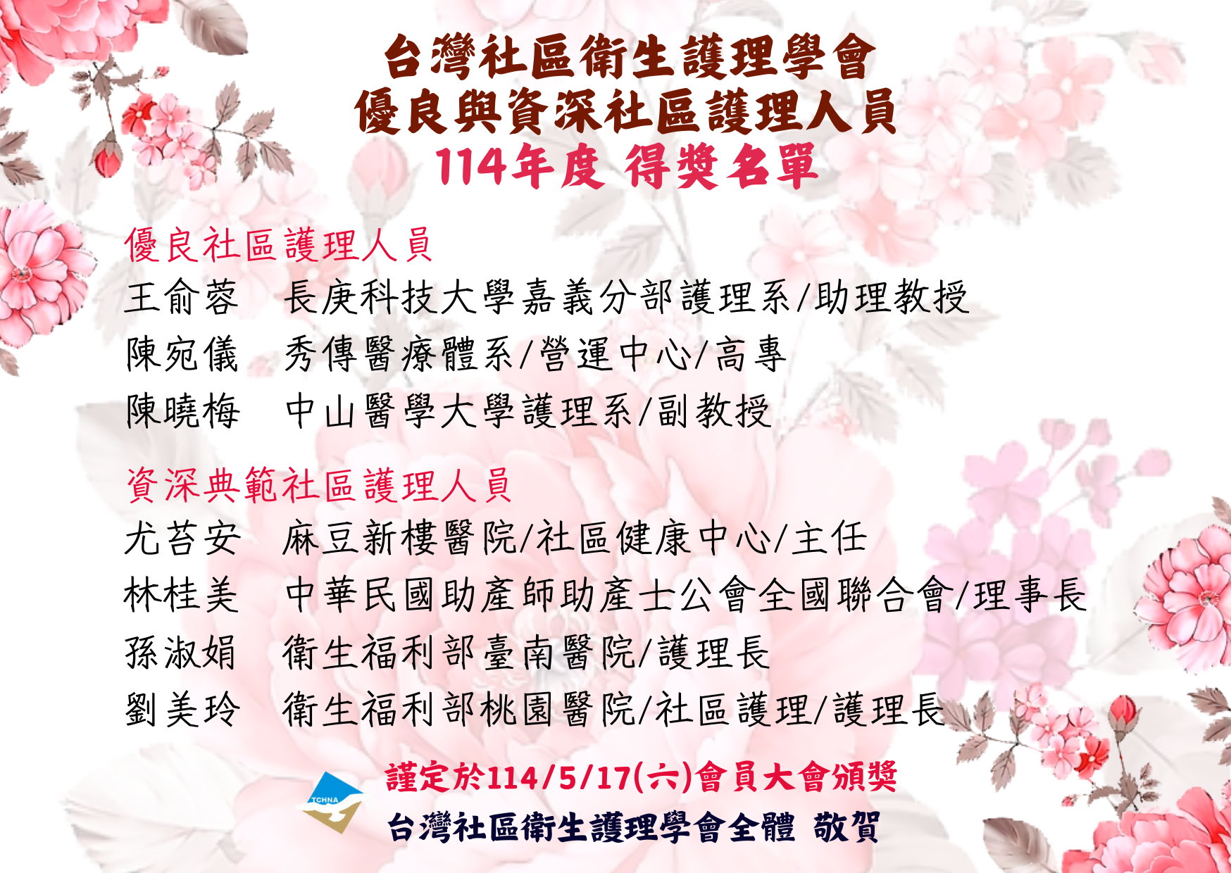 王俞蓉老師獲台灣社區衛生護理學會114年優良社區護理人員