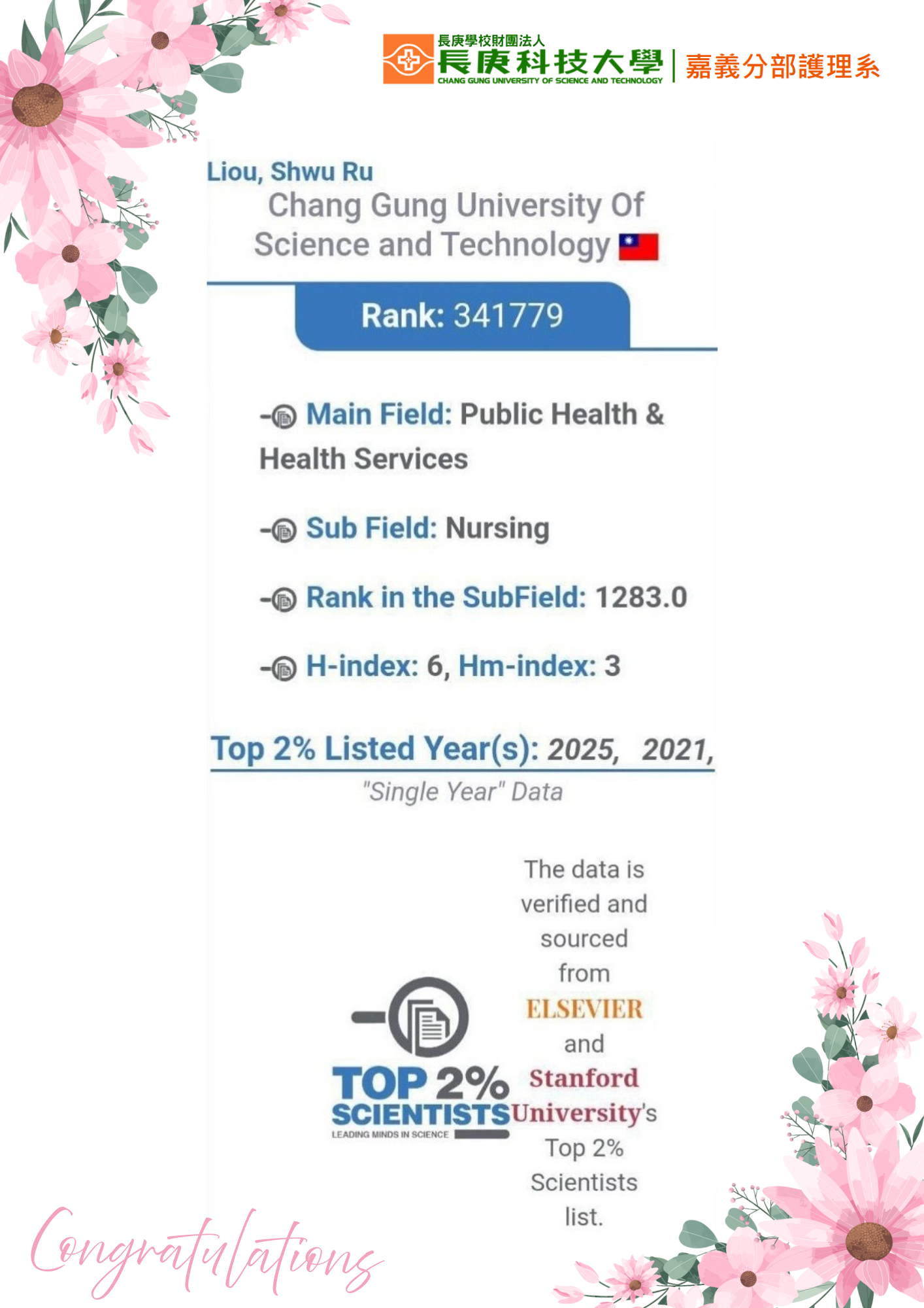嘉義分部護理系劉淑如教授榮登「全球前2%頂尖科學家」榮譽榜單,再度以卓越的學術研究表現,獲得國際學界高度肯定。